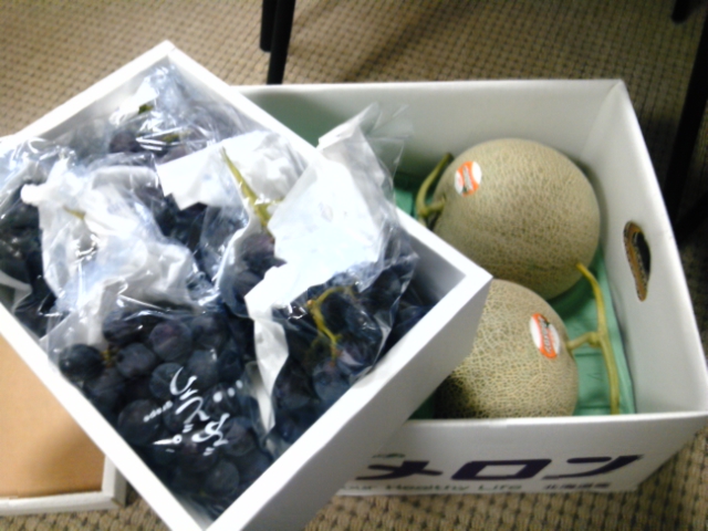 葡萄と、親戚んとこで持って帰りーと渡されたメロン(!)を半分貰って帰ってきました。